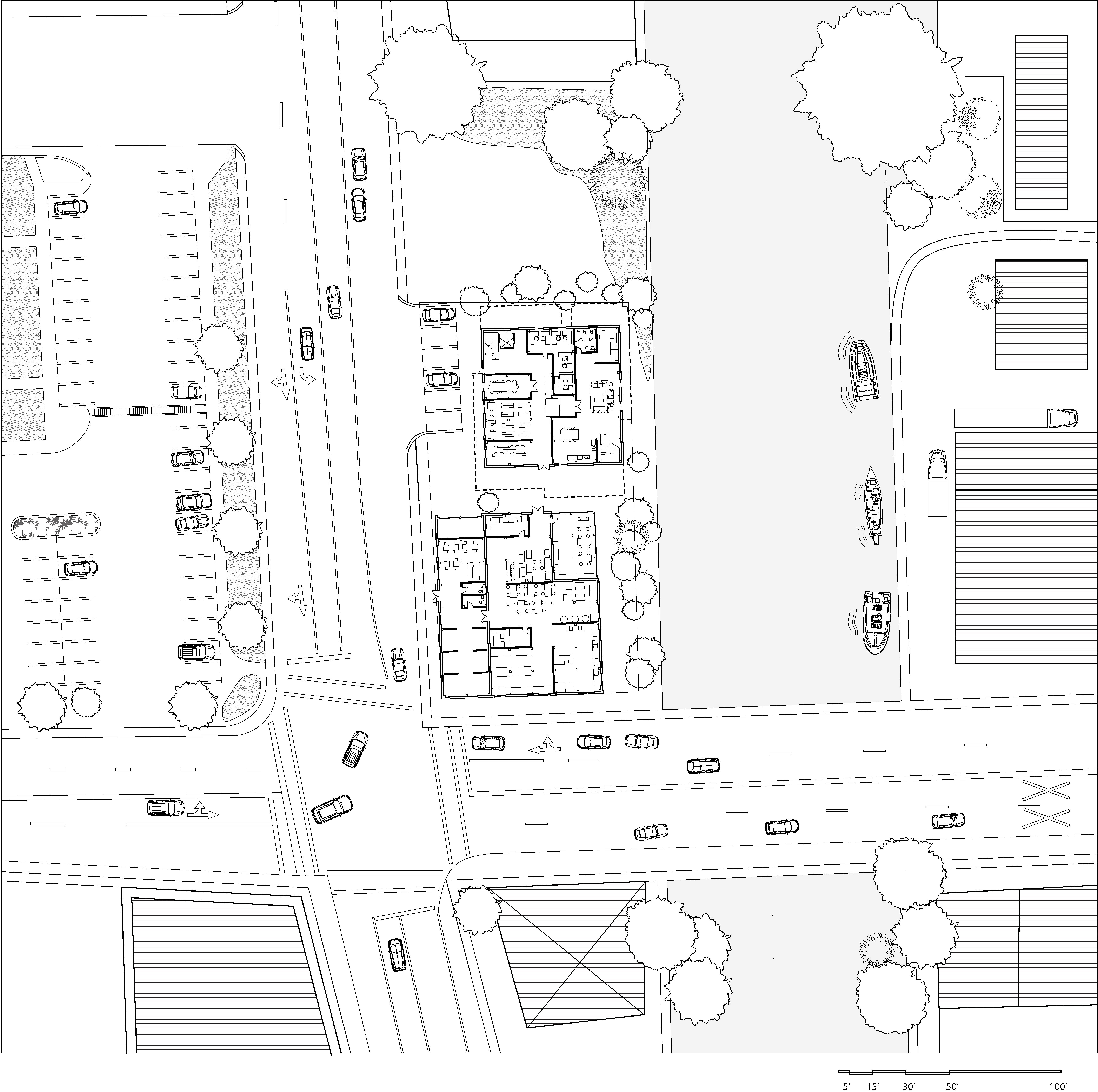 The final project consists of two complexes. The one at the street corner contains the more public programs such as the gallery, café, and the studio spaces for artists. It has a series of triangular skylights going across the whole roof to allow for natural light. The second building toward the back of the site has programs meant for the residents at ground floor such as lecture rooms, offices etc., and the second floor consist of six individual apartments with small courtyard spaces in between.